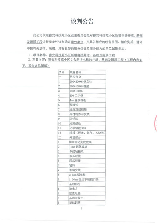 雅安科技苑小區(qū)新增電梯井道、基礎(chǔ)及附屬工程——競爭性談判