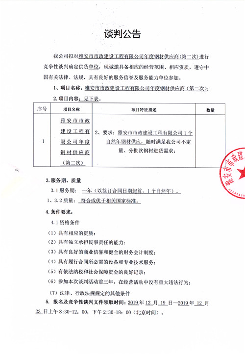 雅安市市政建設(shè)工程有限公司年度鋼材供應(yīng)商競(jìng)爭(zhēng)性談判公告(第二次)