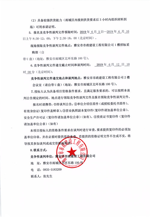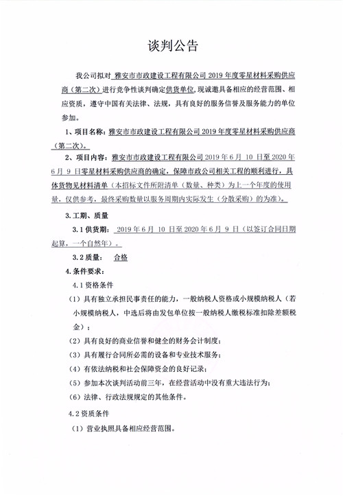 市政公司2019年度零星材料采購(gòu)供應(yīng)商競(jìng)爭(zhēng)性談判公告(第二次)