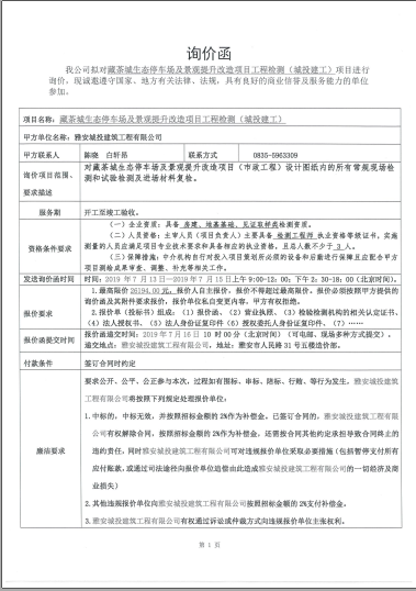 藏茶城生態(tài)停車場(chǎng)及景觀提升改造項(xiàng)目工程檢測(cè)詢價(jià)函