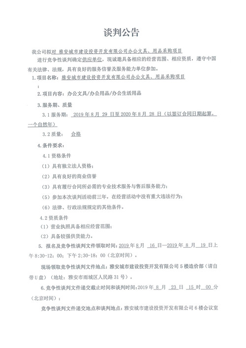 雅安城市建設(shè)投資開發(fā)有限公司辦公文具、用品采購項(xiàng)目競爭性談判公告