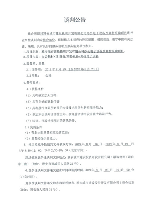 雅安城市建設(shè)投資開發(fā)有限公司辦公電子設(shè)備及耗材采購(gòu)項(xiàng)目競(jìng)爭(zhēng)性談判公告