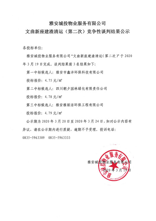城投物業(yè)公司文曲新座建渣清運(yùn)(第二次)競爭性談判結(jié)果公示