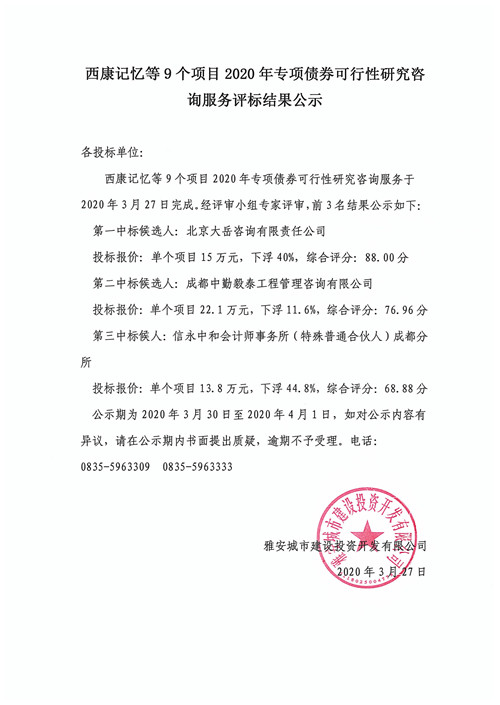 西康記憶等9個(gè)項(xiàng)目2020年專項(xiàng)債券可行性研究咨詢服務(wù)評(píng)標(biāo)結(jié)果公示