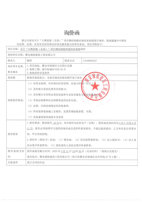 城投建工公司大興壹號(北苑)項目鋼結(jié)構(gòu)臨時接待室裝修詢價函