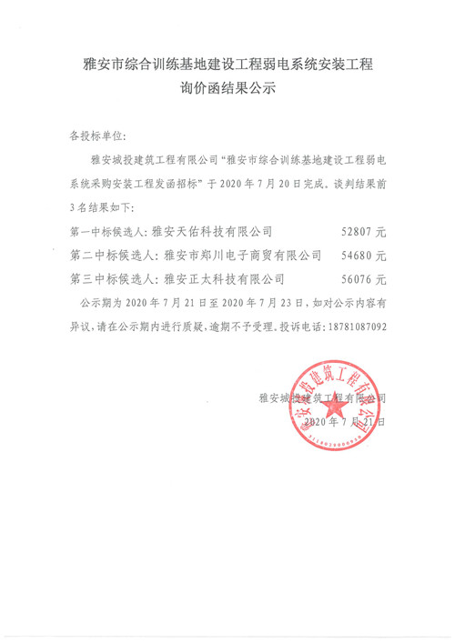 雅安市綜合訓練基地建設工程弱電系統(tǒng)安裝工程詢價函結(jié)果公示