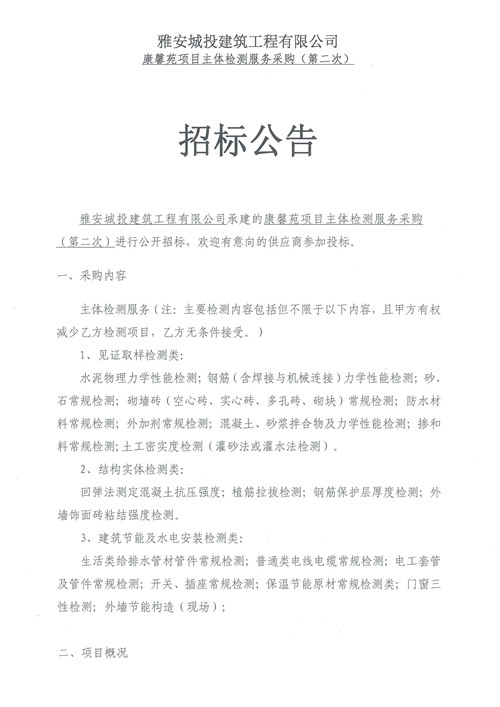 城投建工公司康馨苑項(xiàng)目主體檢測服務(wù)招標(biāo)公告(第二次)