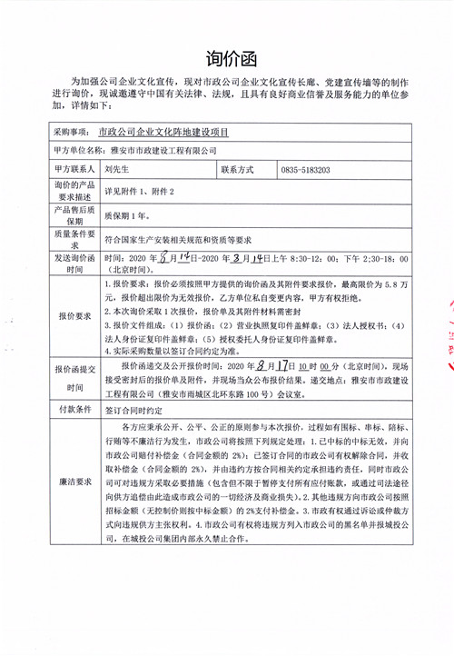 市政公司企業(yè)文化陣地建設(shè)項(xiàng)目詢價(jià)函