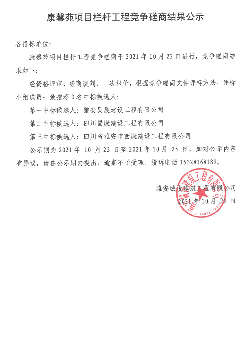 康馨苑項(xiàng)目欄桿工程競(jìng)爭(zhēng)磋商結(jié)果公示