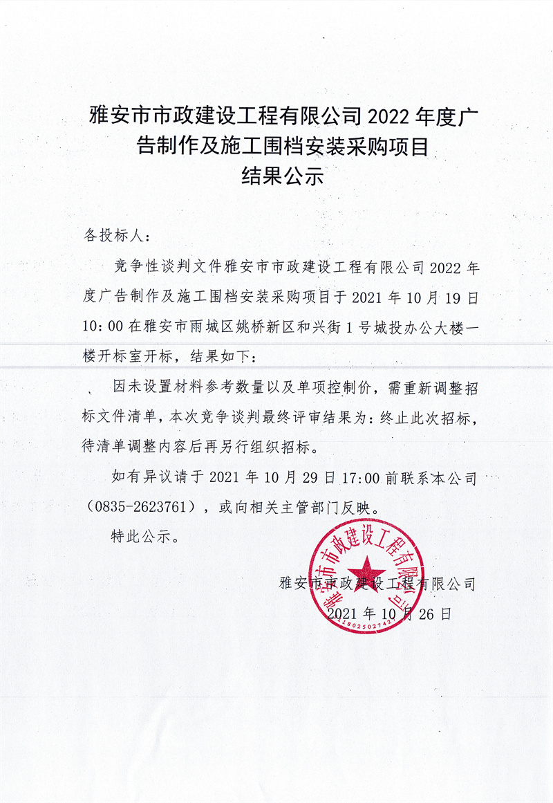 雅安市市政建設(shè)工程有限公司2022年度廣告制作及施工圍檔安裝采購(gòu)項(xiàng)目競(jìng)爭(zhēng)性談判結(jié)果公示