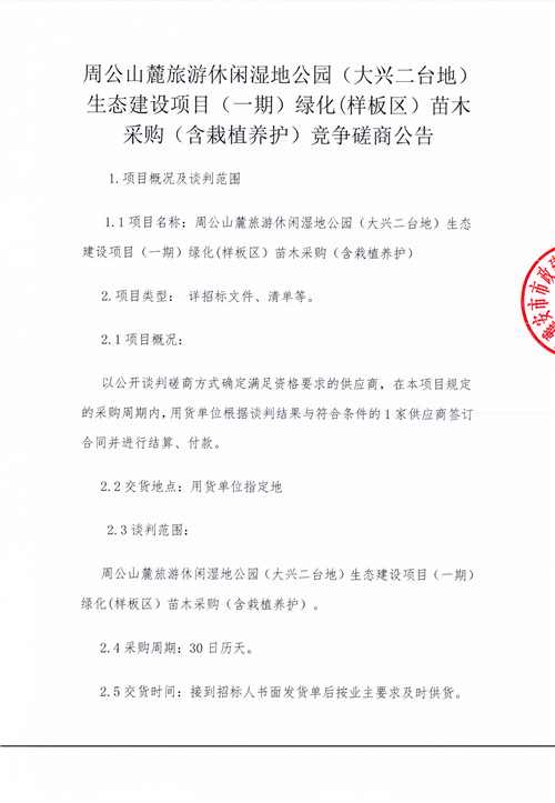 周公山麓旅游休閑濕地公園(大興二臺地)生態(tài)建設(shè)項目(一期)綠化(樣板區(qū))苗木采購(含栽植養(yǎng)護)競爭磋商公告