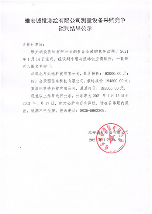 雅安城投測(cè)繪有限公司測(cè)量設(shè)備采購(gòu)競(jìng)爭(zhēng)談判結(jié)果公示
