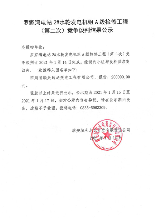 城利水電公司羅家灣電站2#水輪發(fā)電機組A級檢修工程(第二次)競爭性談判結(jié)果公示
