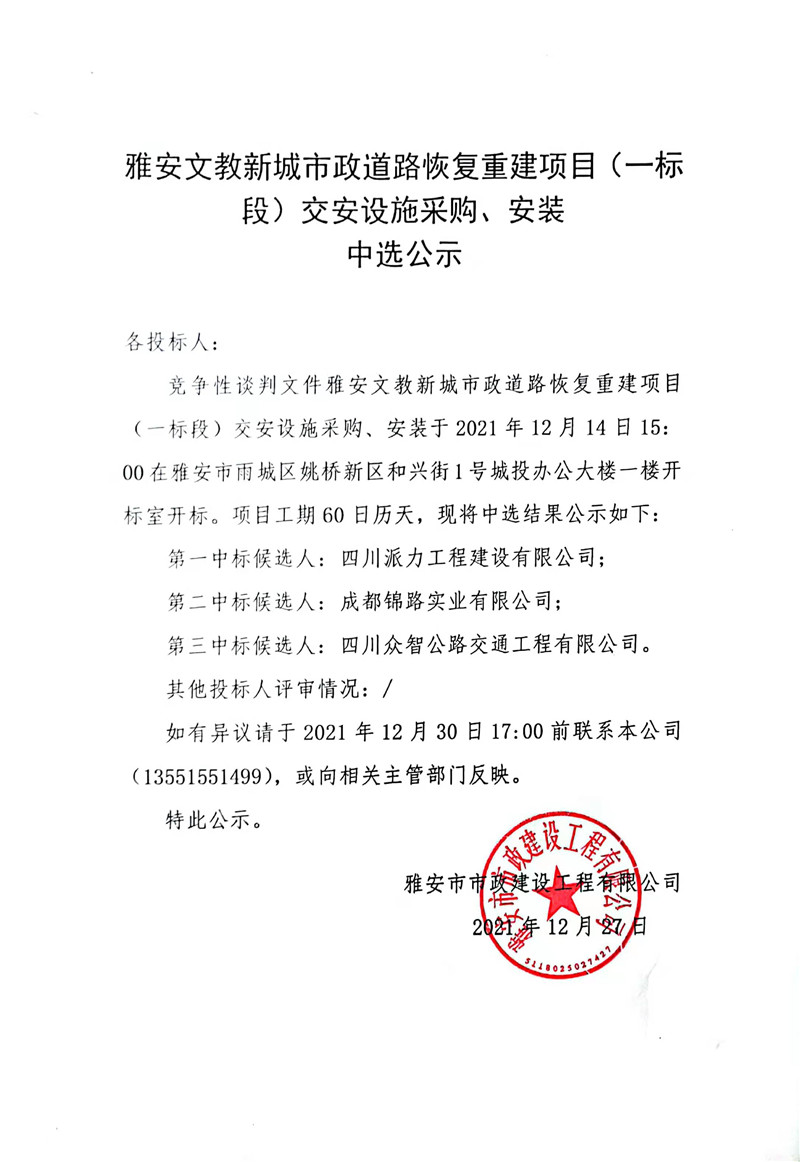 雅安文教新城市政道路恢復(fù)重建項(xiàng)目(一標(biāo)段)交安設(shè)施采購、安裝中選公示
