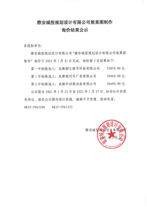 雅安城投規(guī)劃設(shè)計(jì)有限公司效果圖制作詢價結(jié)果公示