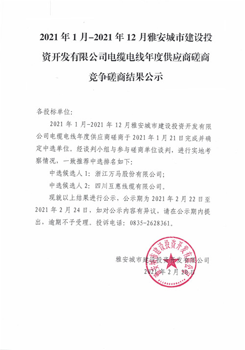 2021年1月-2021年12月雅安城市建設(shè)投資開(kāi)發(fā)有限公司電纜電線年度供應(yīng)商磋商競(jìng)爭(zhēng)磋商結(jié)果公示