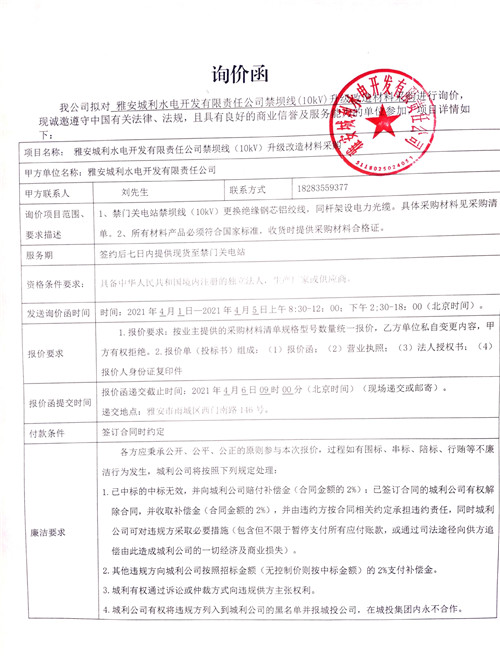 雅安城利水電開(kāi)發(fā)有限責(zé)任公司禁壩線(10kv)升級(jí)改造材料采購(gòu)詢價(jià)函