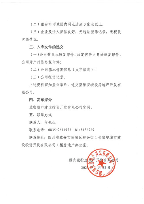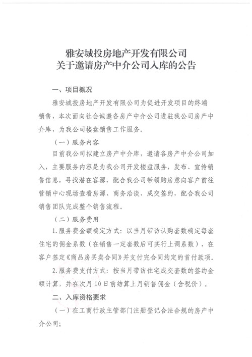 雅安城投房地產開發(fā)有限公司關于邀請房地產中介公司入庫的公告