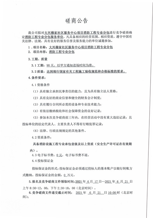 城投建工公司大興穆家社區(qū)服務(wù)中心項(xiàng)目消防工程專業(yè)分包競(jìng)爭(zhēng)性磋商公告