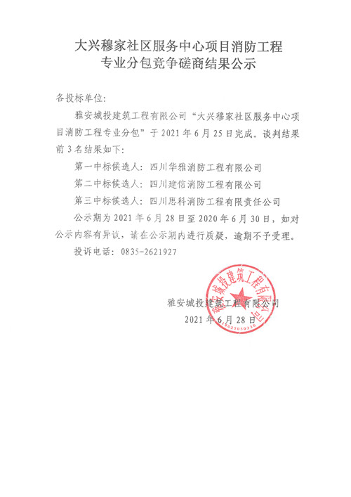 城投建工公司大興穆家社區(qū)服務(wù)中心項(xiàng)目消防工程專業(yè)分包競爭性磋商結(jié)果公示