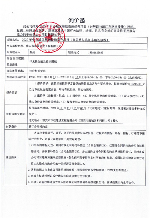 雅安市政公司2020年中心城區(qū)基礎(chǔ)設(shè)施提升項(xiàng)目(興居路與濱江東路連接線)照明、標(biāo)識、標(biāo)牌詢價函