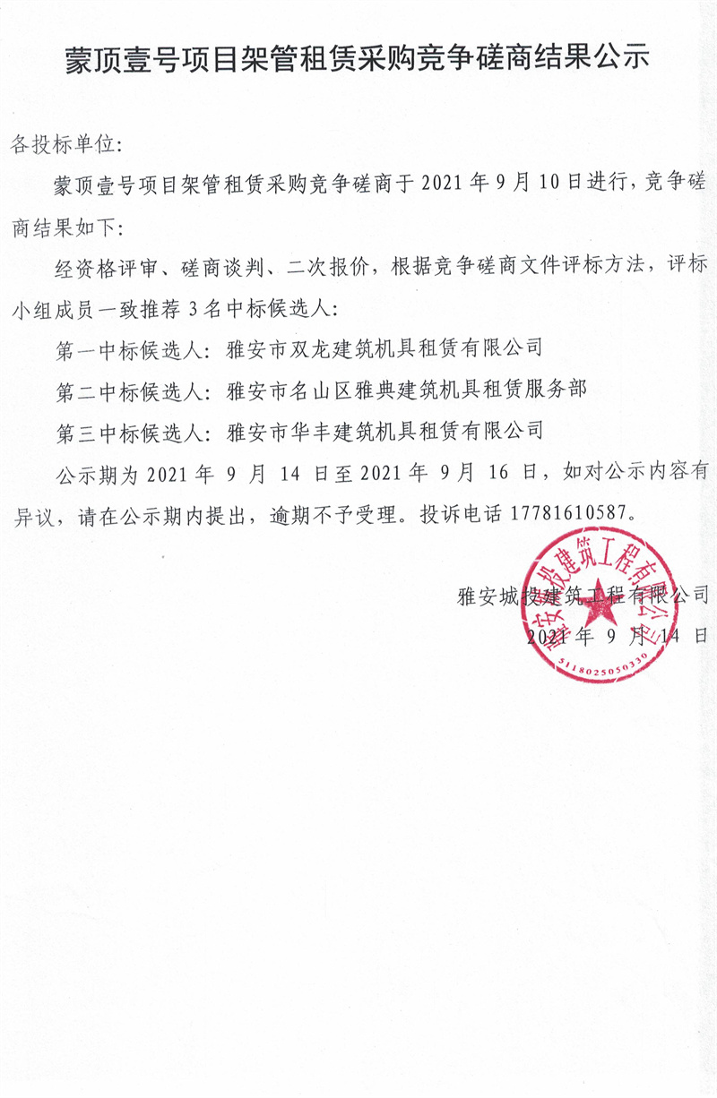 蒙頂壹號項目架管租賃采購競爭磋商結果公示
