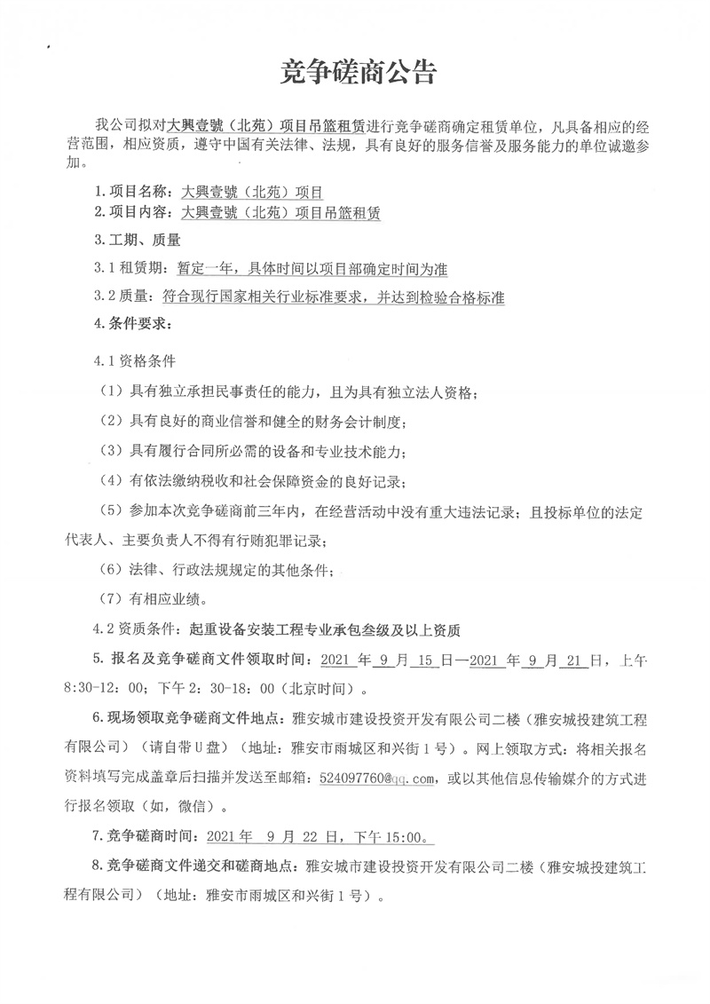 大興壹號(北苑)項目吊籃租賃競爭性磋商公告