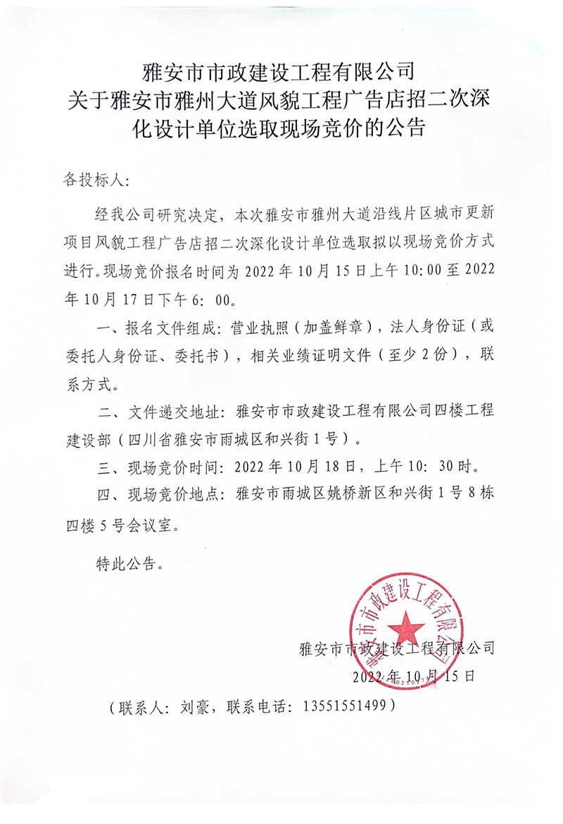 關(guān)于雅安市雅州大道風貌工程廣告店招二次深化設(shè)計單位選取現(xiàn)場競價的公告