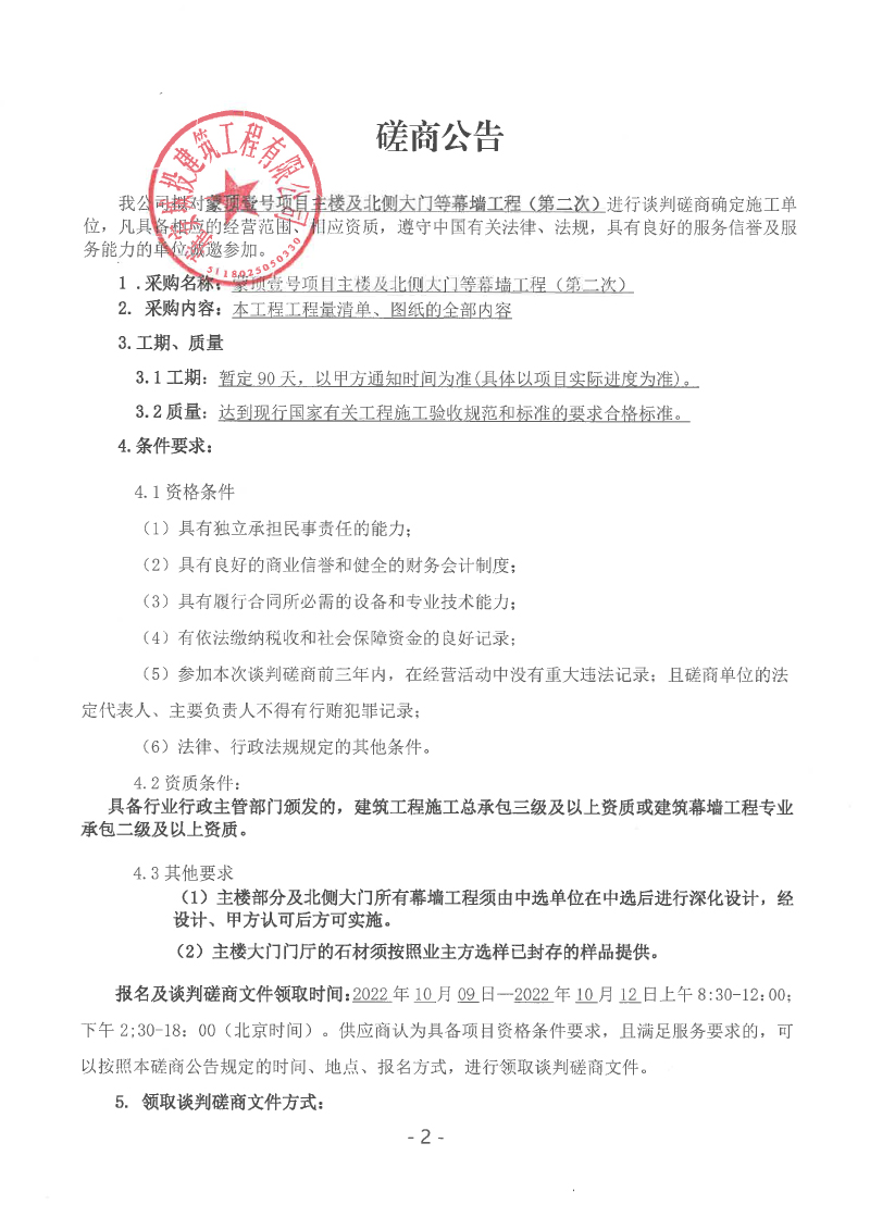 蒙頂壹號項目主樓及北側(cè)大門等幕墻工程(第二次)談判磋商公告