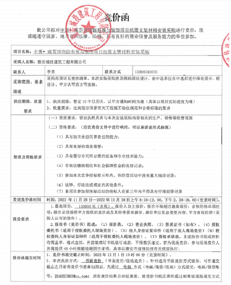 中國藏茶博物館布展與裝飾項目抗震支架材料安裝競價公告