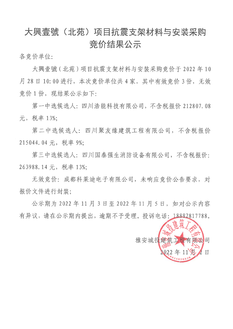 大興壹號(北苑)項(xiàng)目抗震支架材料與安裝采購競價結(jié)果公示