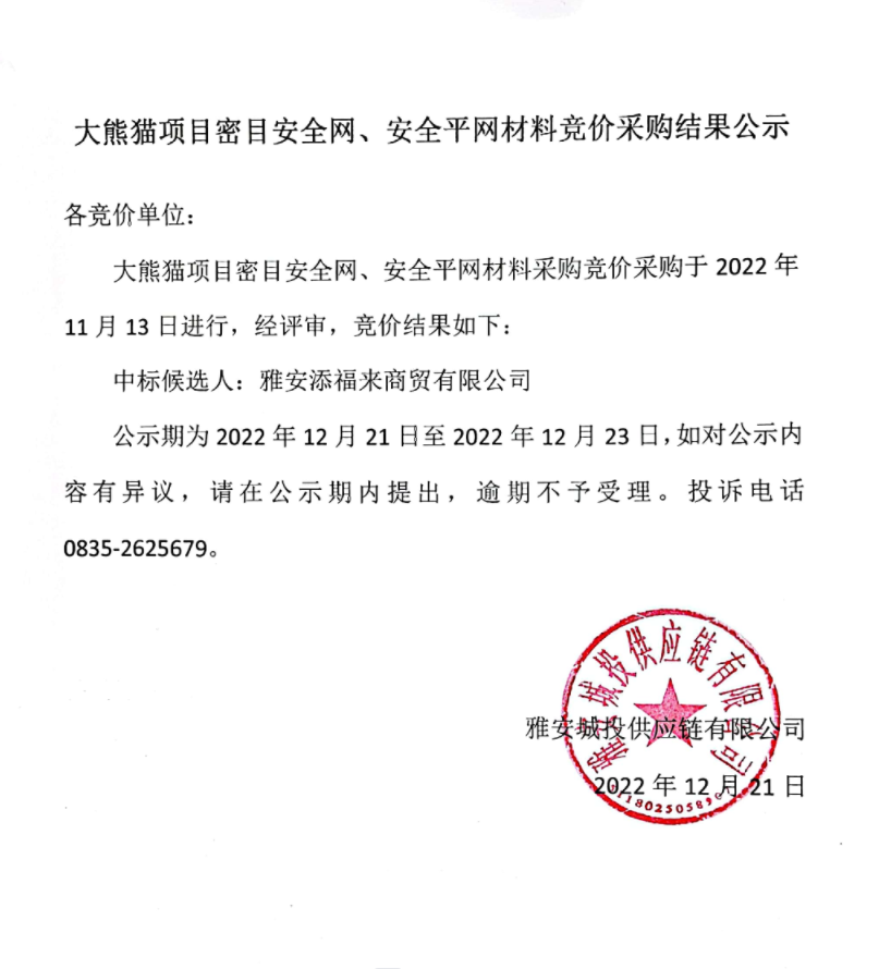 大熊貓項目密目安全網(wǎng)、安全平網(wǎng)材料競價采購結(jié)果公示