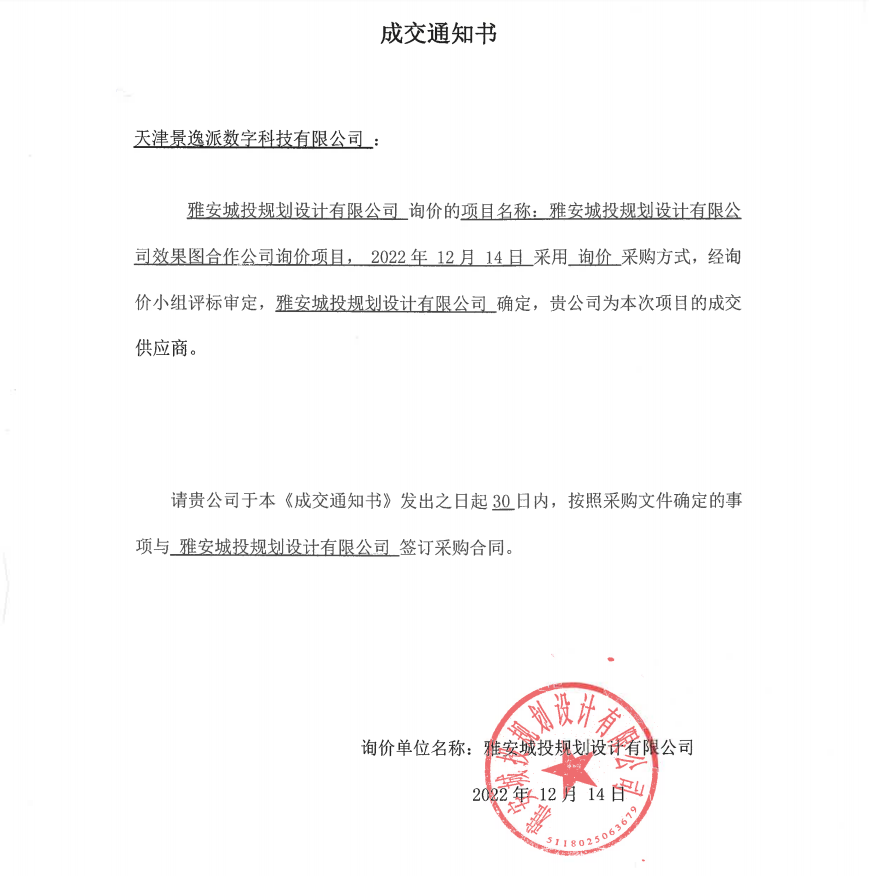 雅安城投規(guī)劃設(shè)計(jì)有限公司效果圖詢價(jià)成交通知書