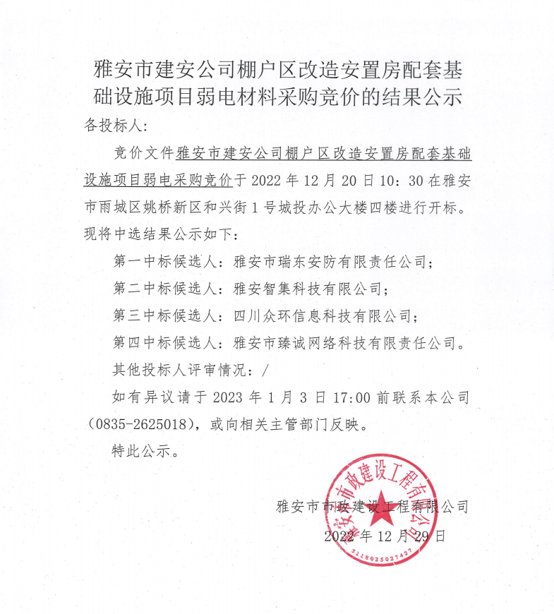 雅安市建安公司棚戶區(qū)改造安置房配套基礎(chǔ)設(shè)施項(xiàng)目弱電材料采購(gòu)競(jìng)價(jià)結(jié)果公示