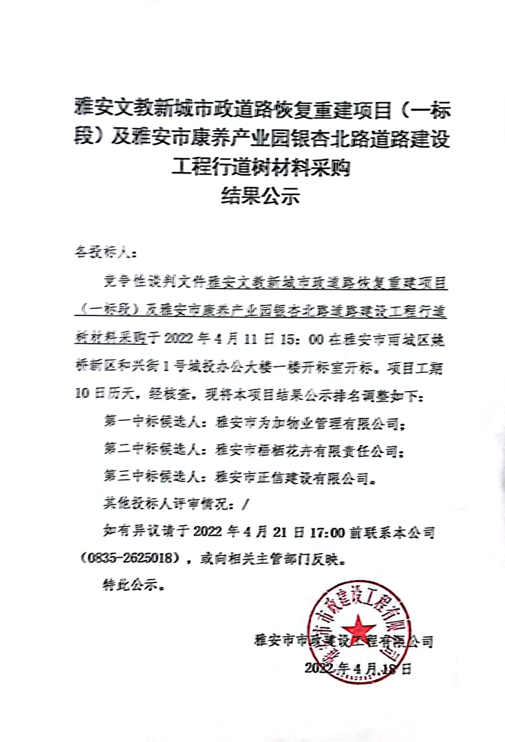 雅安文教新城市政道路恢復(fù)重建項(xiàng)目(一標(biāo)段)及雅安市康養(yǎng)產(chǎn)業(yè)園銀杏北路道路建設(shè)工程行道樹(shù)材料采購(gòu)結(jié)果公示