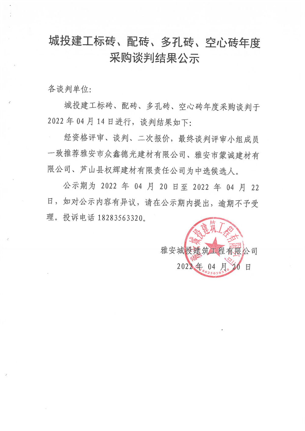 城投建工標磚、配磚、多孔磚、空心磚年度采購競爭性談判結(jié)果公示
