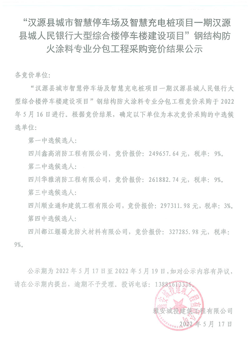 漢源縣城市智慧停車場(chǎng)及智慧充電樁項(xiàng)目一期漢源縣城人民銀行大型綜合樓停車樓建設(shè)項(xiàng)目防火涂料專業(yè)分包工程采購競(jìng)價(jià)結(jié)果公示