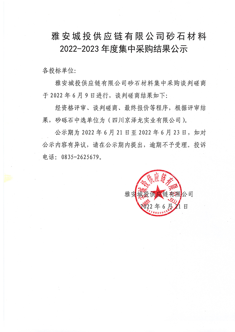 雅安城投供應鏈有限公司砂石材料2022-2023年度集中采購結果公示