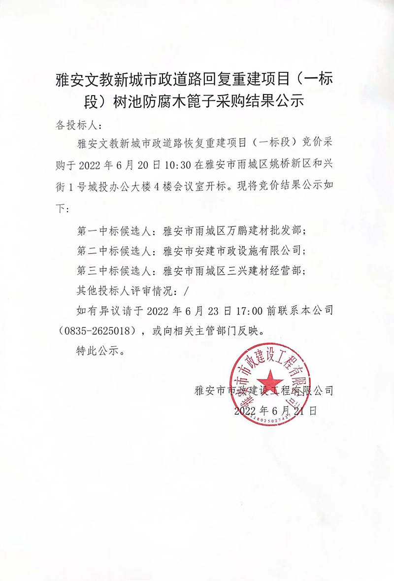 雅安市文教新城市政道路恢復 重建項目工程(一標段)樹池防腐木篦子采購結(jié)果公示