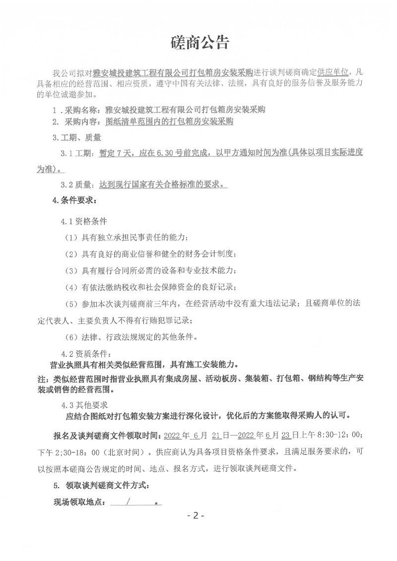 雅安城投建筑工程有限公司打包箱房安裝采購談判磋商公告