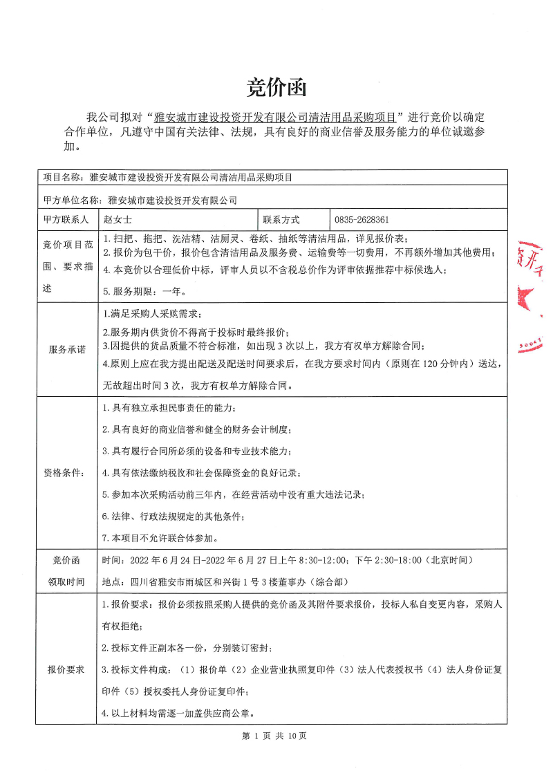 雅安城市建設(shè)投資開(kāi)發(fā)有限公司清潔用品采購(gòu)項(xiàng)目競(jìng)價(jià)公告