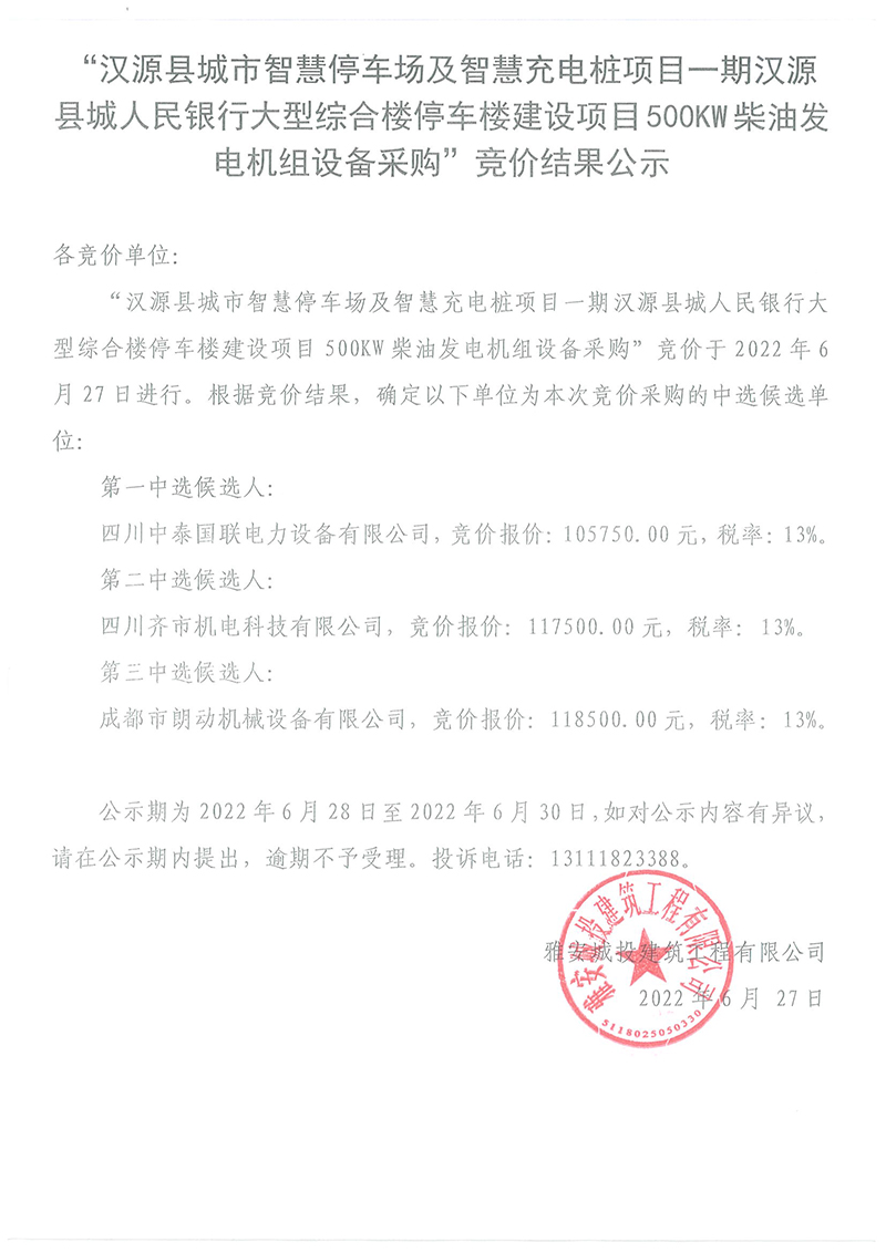 漢源縣城市智慧停車場及智慧充電樁項目一期漢源縣城人民銀行大型綜合樓停車樓建設項目500kw柴油發(fā)電機組設備采購競價結果公告