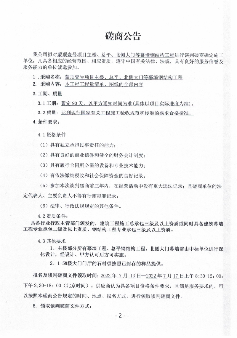 蒙頂壹號(hào)項(xiàng)目主樓、總坪、北側(cè)大門幕墻鋼結(jié)構(gòu)工程談判磋商公告