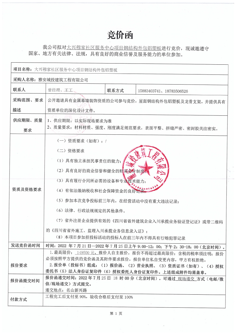 大興穆家社區(qū)服務(wù)中心項(xiàng)目鋼結(jié)構(gòu)外包鋁塑板競(jìng)價(jià)公告