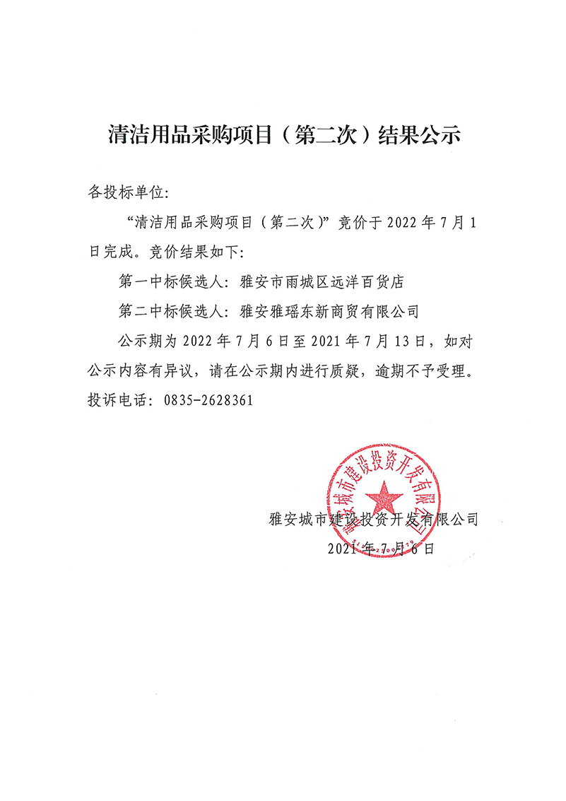 雅安城市建設(shè)投資開發(fā)有限公司清潔用品采購項(xiàng)目(第二次)結(jié)果公示