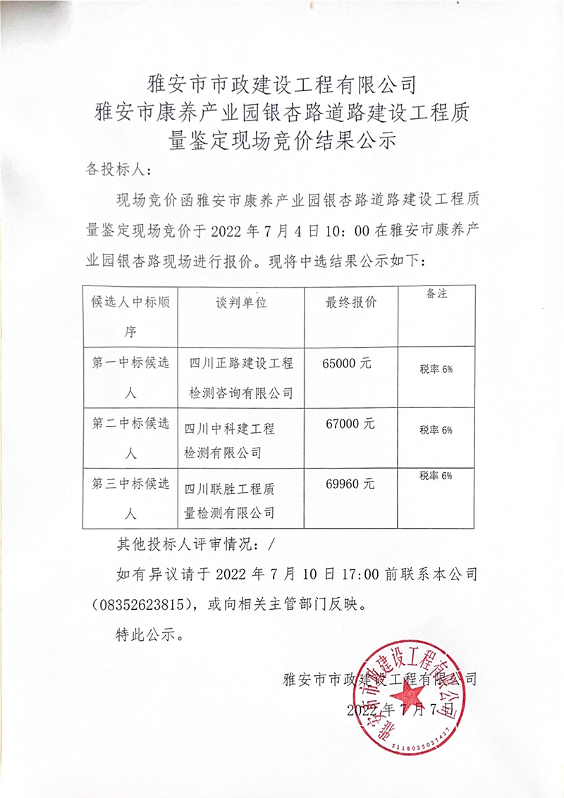 雅安市康養(yǎng)產業(yè)園銀杏路道路建設工程道路質量鑒定現(xiàn)場競價公告