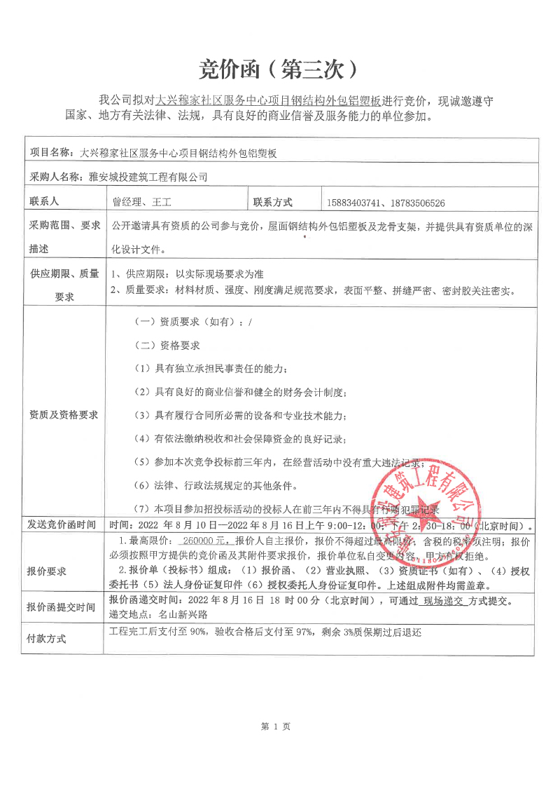 大興穆家社區(qū)服務(wù)中心項目鋼結(jié)構(gòu)外包鋁塑板競價公告(第三次)
