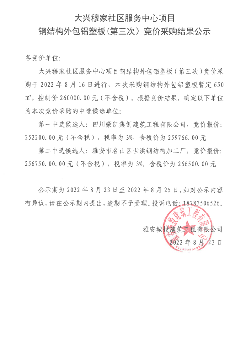 大興穆家社區(qū)服務(wù)中心項(xiàng)目鋼結(jié)構(gòu)外包鋁塑板(第三次)競價(jià)采購結(jié)果公示