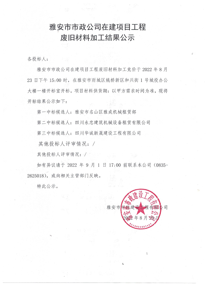 雅安市市政公司在建項目工程廢料加工結(jié)果公示