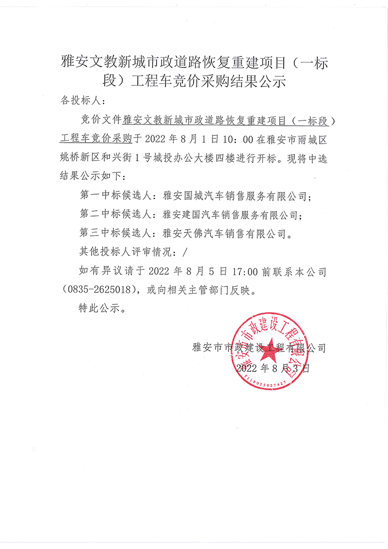 雅安文教新城市政道路恢復(fù)重建項(xiàng)目(一標(biāo)段)工程車(chē)競(jìng)價(jià)采購(gòu)結(jié)果公示